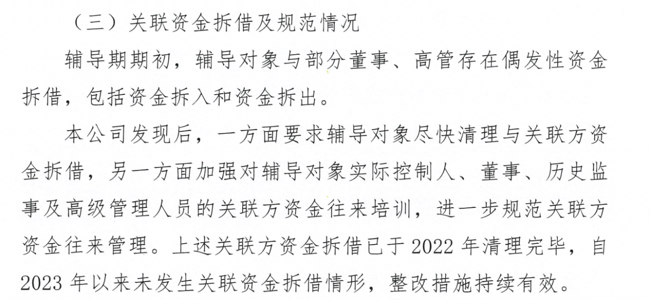 根据报告,辅导期期初,长进光子与部分董事、高管存在偶发性资金拆借,包括资金拆入和资金拆出。国泰海通发现后,一方面要求辅导对象尽快清理与关联方资金拆借,另一方面加强对辅导对象实际控制人、董事、历史监事及高级管理人员的关联方资金往来培训,进一步规范关联方资金往来管理。上述关联方资金拆借已于2022年清理完毕,自2023年以来未发生关联资金拆借情形,整改措施持续有效。