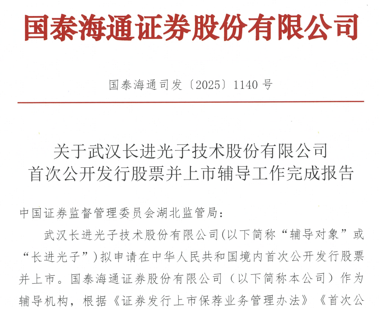 瑞财经 刘治颖 近日,武汉长进光子技术股份有限公司(以下简称:长进光子)披露关于首次公开发行股票并上市辅导工作完成报告,国泰海通为辅导机构。