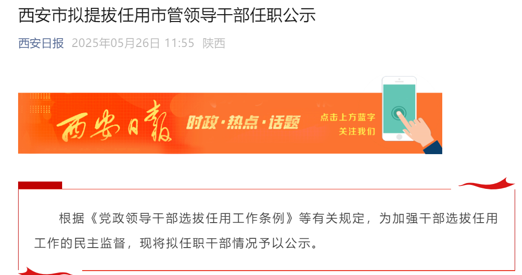 据悉,5月26日,西安日报刊登西安市委组织部拟提拔任用市管干部任职公示。其中现任西安银行党委委员、副行长张成喆,拟任市属国有企业正职。