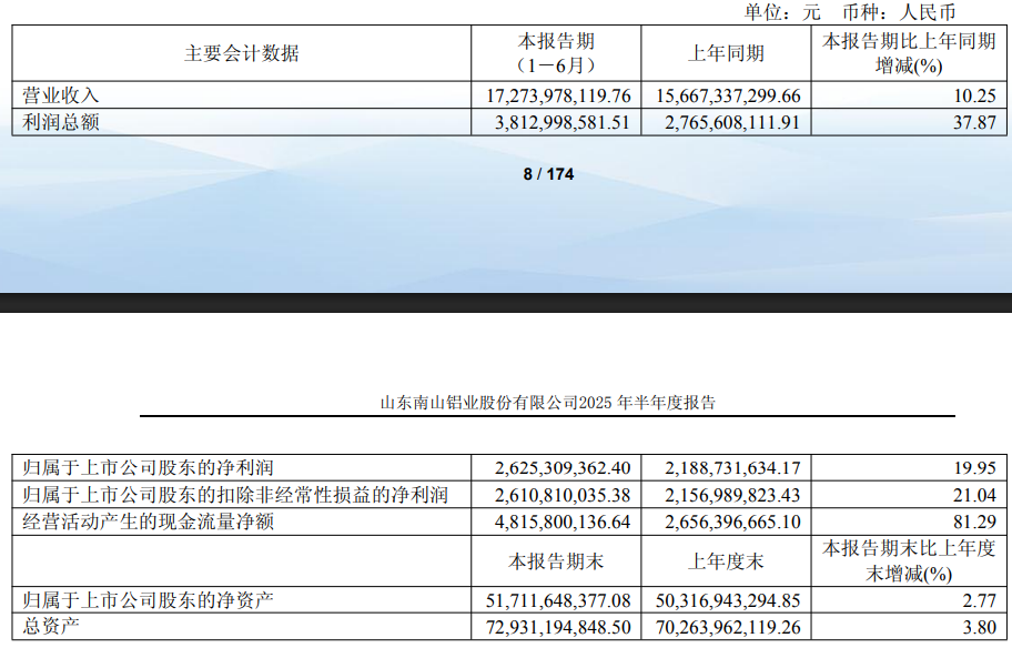 报告显示,南山铝业公司上半年营业收入为172.74亿元,同比增长10.25%;归母净利润为26.25亿元,同比增长19.95%;扣非归母净利润为26.11亿元,同比增长21.04%;基本每股收益0.23元。
