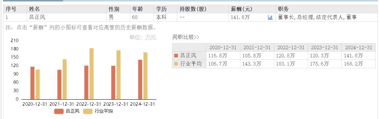 据东方财富网数据,南山铝业董事长兼总经理吕正风2024年薪酬为141.8万元,相较上年薪酬120.3万元涨薪17.87%。