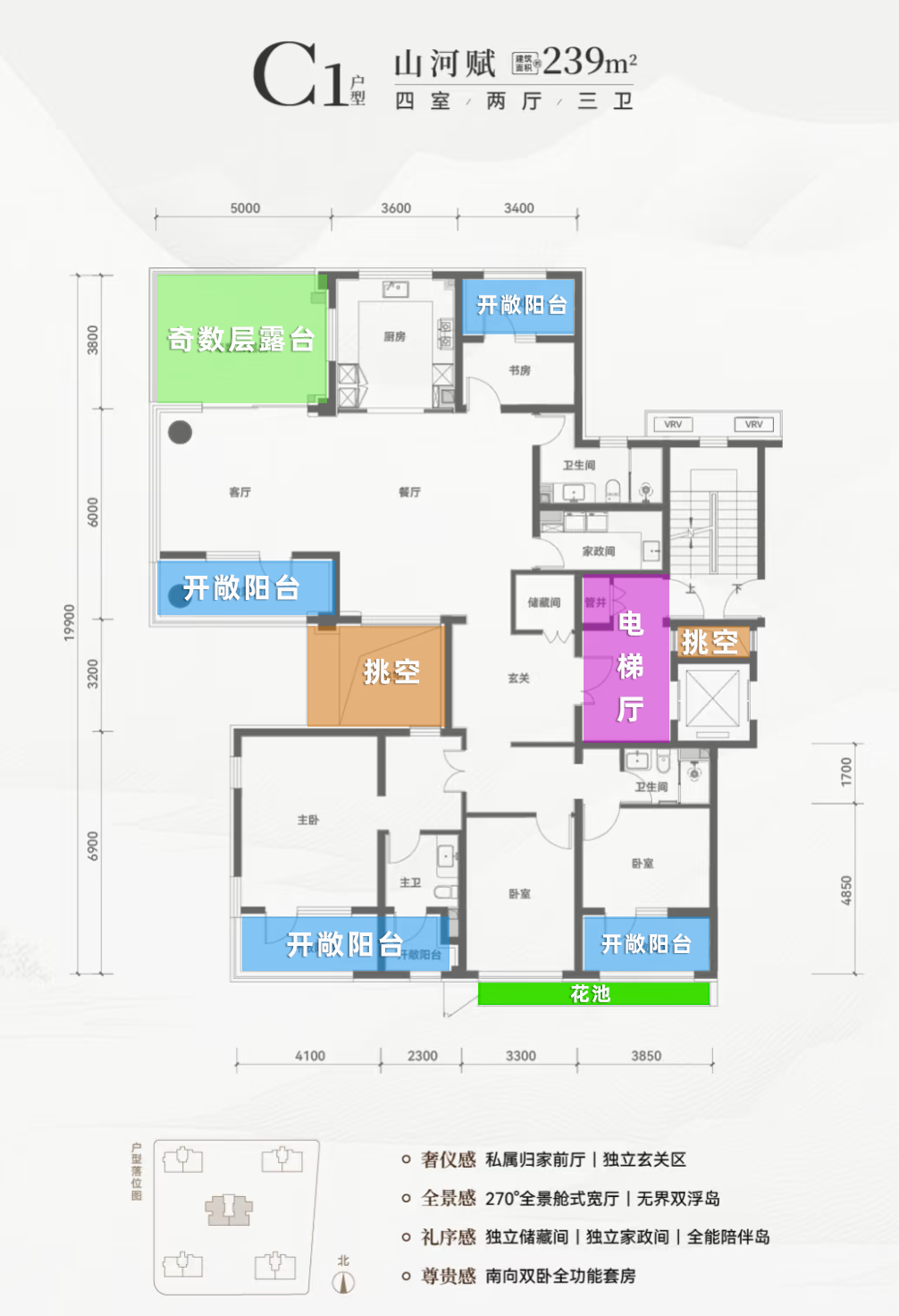 建面239㎡楼王产品,私梯入户,三道玄关,动静分区,私密性、功能性都给到了。