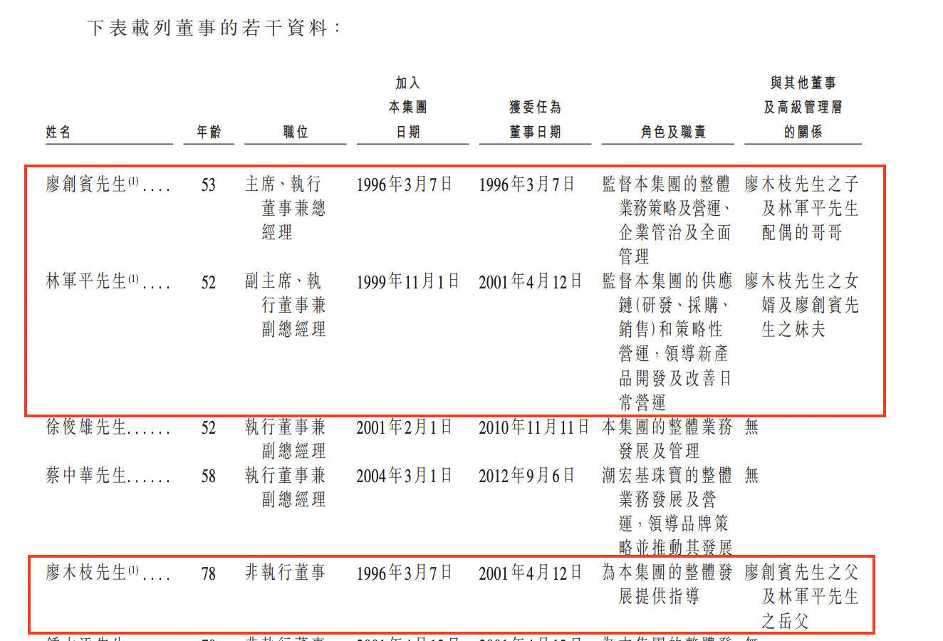 目前,53岁廖创宾目前担任潮宏基主席、执行董事兼总经理,52岁林军平担任副主席、执行董事兼副总经理,78岁廖木枝担任非执行董事。