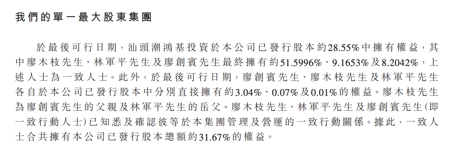 廖木枝为廖创宾的父亲及林军平的岳父。廖木枝、林军平及廖创宾(即一致行动人士)已知悉及确认他们于集团管理及营运的一致行动关系。据此,一致人士合共拥有公司已发行股本总额约31.67%的权益。