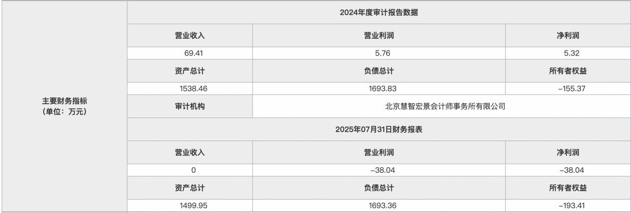 2024年、2025年前7月,标的企业营收分别为69.41万元、0元,净利润分别为5.32万元、-38.04万元。截至2025年7月末,标的企业资产总计1499.95万元,负债总计1693.36万元。