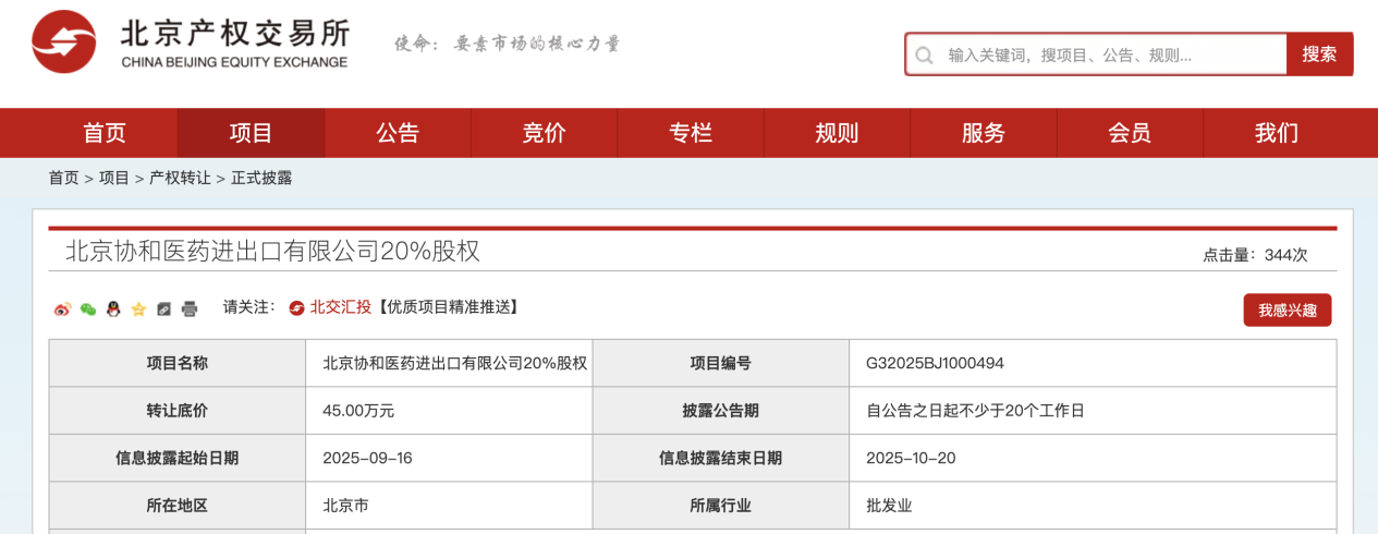 保利集团挂牌转让北京协和医药进出口20%股权,底价45万元