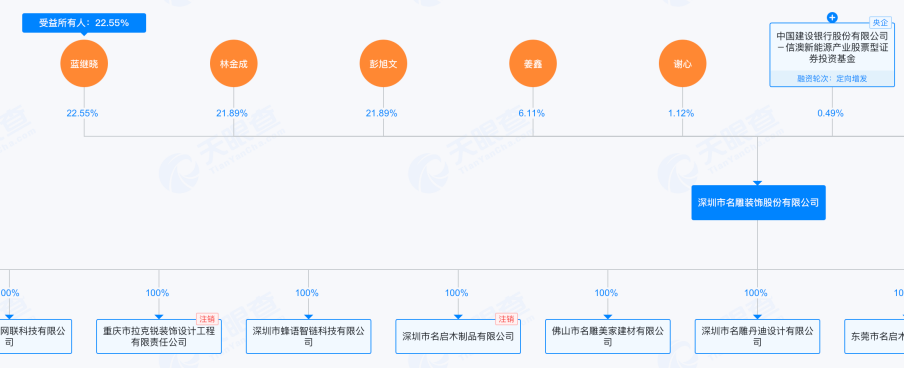 据天眼查,蓝继晓为名雕股份的第一大股东,同时也是该公司现任董事长,其持股比例为22.55%,而姜鑫则位列名雕股份的第四大股东,持股比例为6.11%。