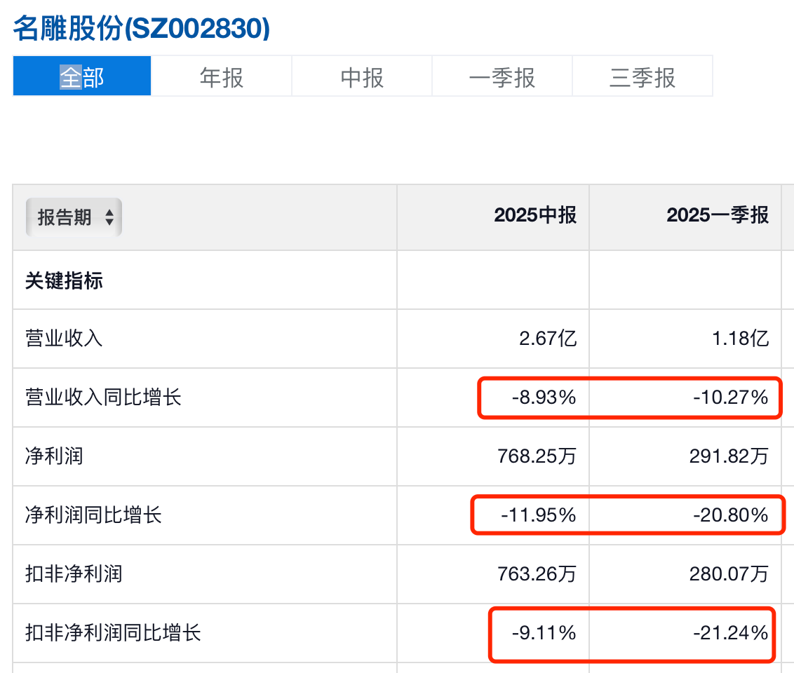 而最新的2025年中报披露,名雕股份实现营业收入2.67亿元,同比下降8.93%;归母净利润768.25万元,同比下降11.95%;扣非净利润763.26万元,同比下降9.11%。