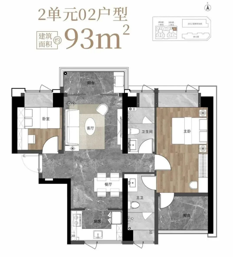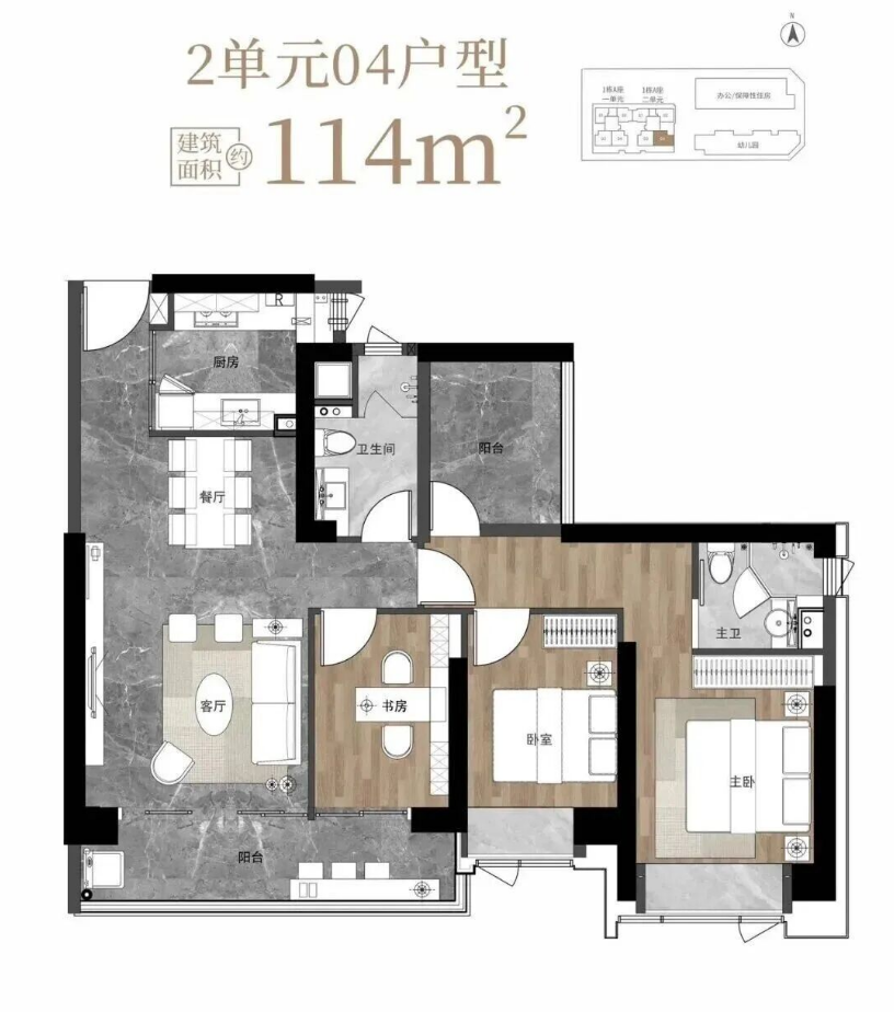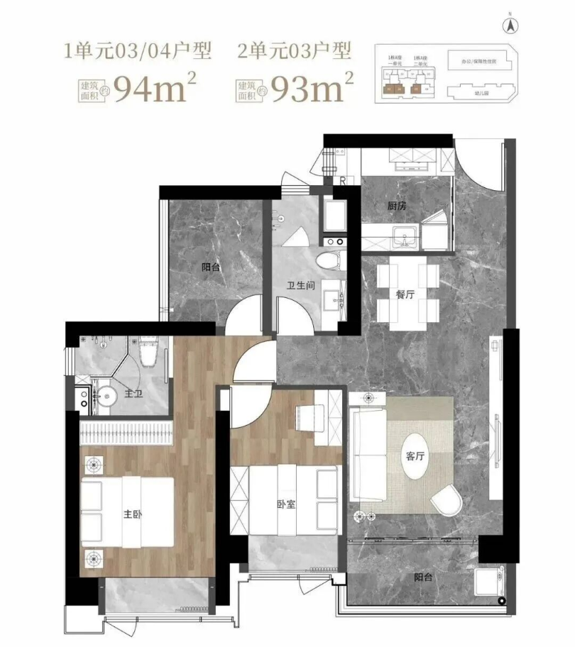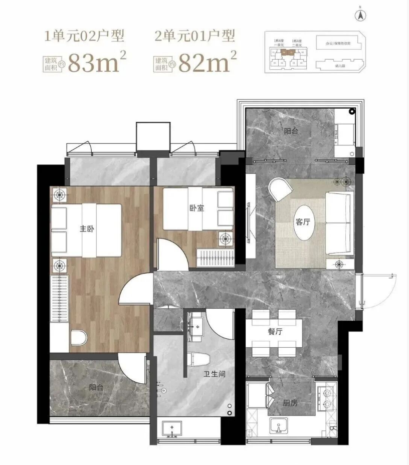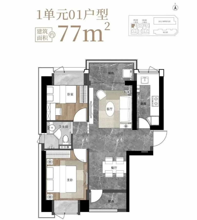 户型涵盖建面约77㎡两房一卫,82-83㎡三房一卫,93-94㎡三房两卫以及114㎡四房两卫,户型使用率85%-90%左右。