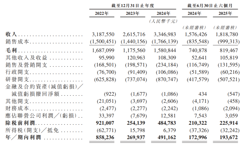 业绩方面,2022年、2023年、2024年及2025年截至6月30日止六个月(报告期内),圣邦股份实现收入分别约为31.88亿元、26.16亿元、33.47亿元及18.19亿元;同期,年/期内利润约为8.58亿元、2.7亿元、4.91亿元及1.94亿元。
