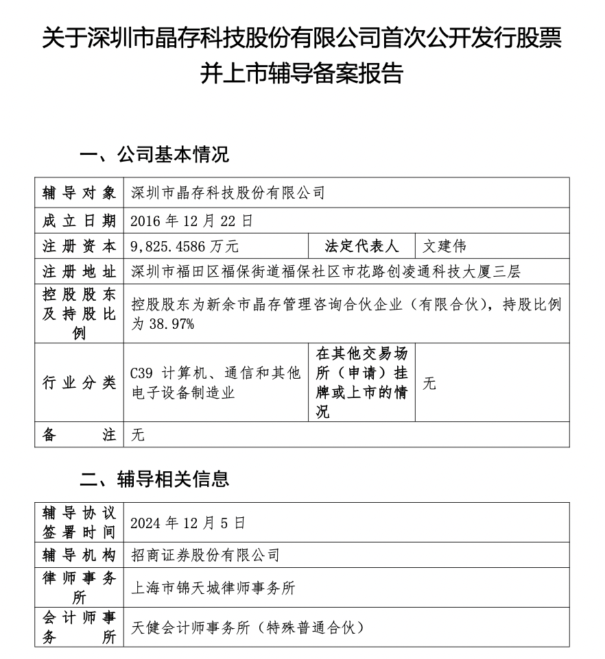 值得注意的是,晶存科技曾筹划冲击A股。2024年12月,其启动IPO辅导,彼时的辅导机构为招商证券股份有限公司,期间共进行两期辅导。