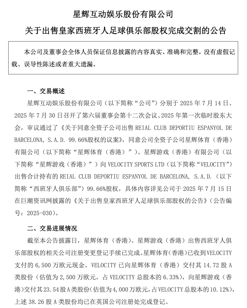 据了解,星辉娱乐分别于2025年7月14日、2025年7月30日召开了第六届董事会第十二次会议、2025年第一次临时股东大会,审议通过了《关于同意全资子公司出售REIAL CLUB DEPORTIU ESPANYOL DE BARCELONA, S.A.D. 99.66%股权的议案》,同意公司全资子公司星辉体育(香港)、星辉游戏(香港)向VELOCITY出售合计持有的西班牙人俱乐部99.66%股权