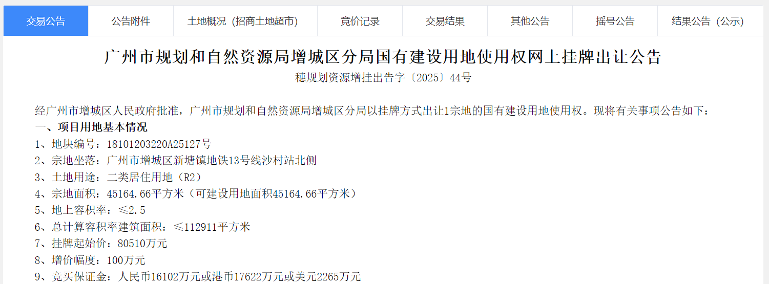 粤进深 赵盼盼 10月10日,据广州市规划和自然资源局,增城区新塘镇地铁13号线沙村站北侧18101203220A25127号地块挂牌,拟于11月10日10时进行限时竞价。