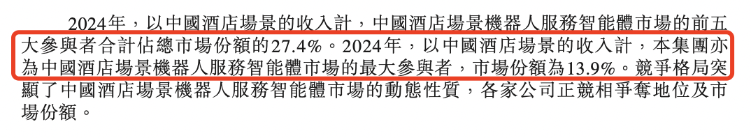 2024年,以中国酒店场景的收入计,中国酒店场景机器人服务智能体市场的前五大参与者合计占总市场份额的27.4%。2024年,以中国酒店场景的收入计,集团亦为中国酒店场景机器人服务智能体市场的最大参与者,市场份额为13.9%。