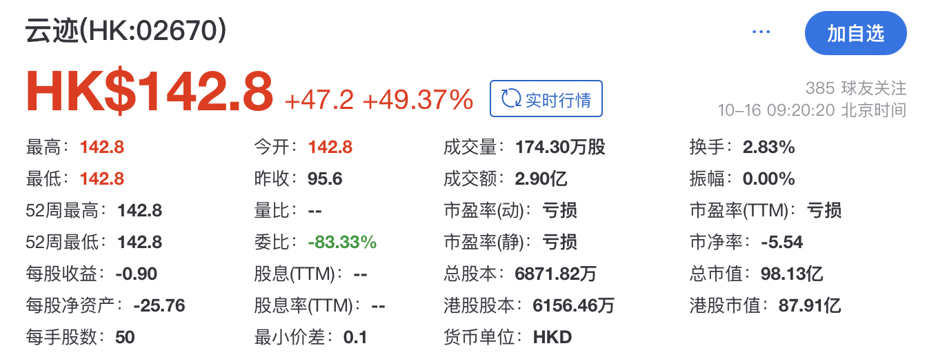 乐居财经 吴文婷 10月16日,云迹(02670.HK)在港交所挂牌上市,中信证券和建银国际为联席保荐人。其开盘报142.8港元,涨49.37%,总市值约98.13亿港元。