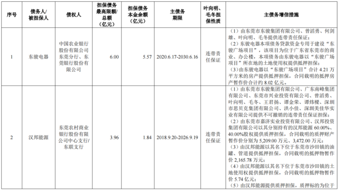截至递表前,公司实控人叶向明和毛冬存在大额对外担保情形,其对东骏电器、汉邦能源等其控制企业以外的第三方提供的担保债务本金余额为7.41亿元,其中东骏电器担保债务本金余额5.57亿元、汉邦能源担保债务本金余额1.84亿元。