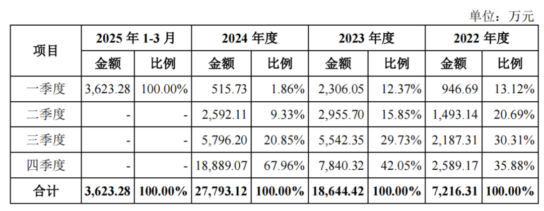 莱普科技的收入存在明显的季节性特征。以2024年为例,一季度收入只有515.73万元,占比仅1.86%,而四季度收入占比则高达67.96%。公司表示,主要是下游客户通常于年初制定资本性支出计划,此后陆续开展采购、安装和验收活动所致。