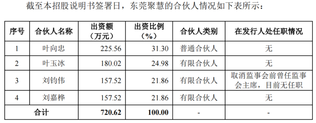 此外,东莞聚慧由叶向明的弟弟叶向忠以及另外一名叶姓成员叶玉冰分别持有31.3%、24.98%份额。