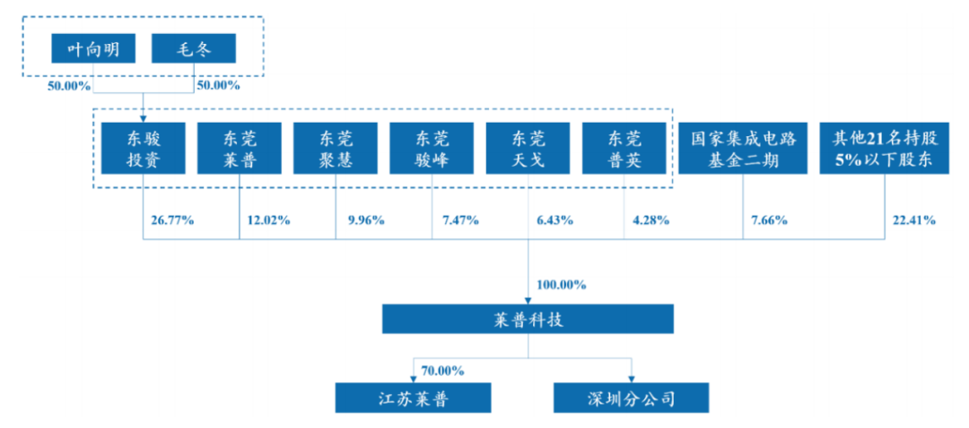 递表前,叶向明、毛冬通过东骏投资持有公司26.77%股权,并控制公司66.94%的表决权。此外,国家集成电路基金二期为第一大外部股东,持股7.66%。