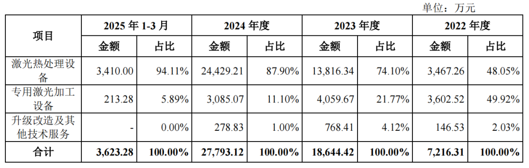 其中,激光热处理设备收入占比从2022年的48.05%升至2025年一季度的94.11%,同时,专用激光加工设备收入占比由49.92%骤降至5.89%。