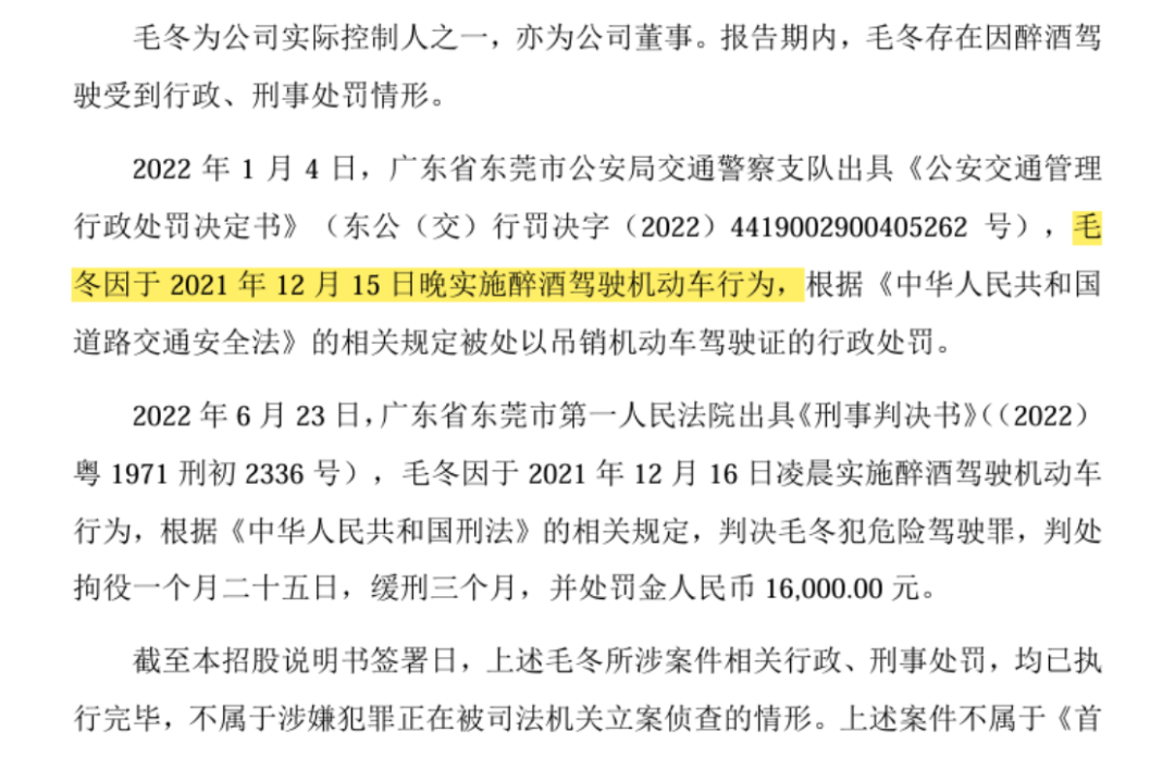 此外,毛冬还曾因醉酒驾驶受到行政、刑事处罚。2021年12月15日晚,毛冬因醉驾被吊销机动车驾驶证,并判处拘役一个月二十五日,缓刑三个月,并处罚金1.6万元。