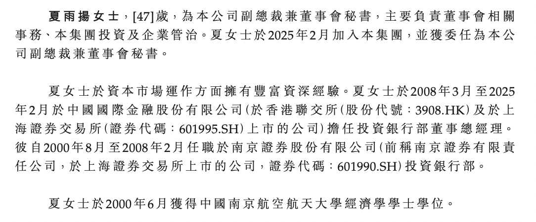 另外,夏雨扬女士,47岁,为公司副总裁兼董事会秘书,主要负责董事会相关事务、集团投资及企业管治。夏雨扬于2025年2月加入集团,并获委任为公司副总裁兼董事会秘书。
