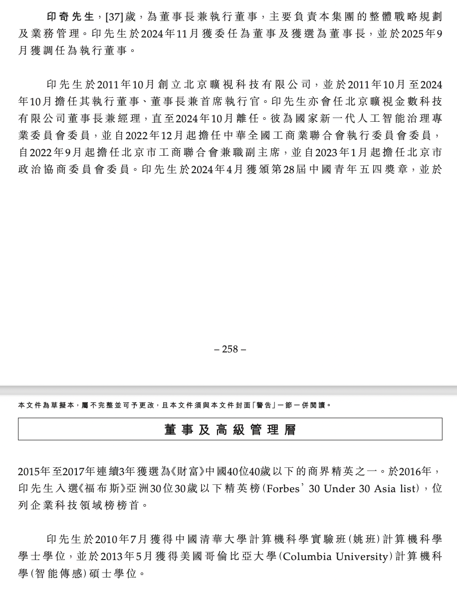 资料显示,印奇,37岁,为董事长兼执行董事,主要负责集团的整体战略规划及业务管理。印奇于2024年11月获委任为董事及获选为董事长,并于2025年9月获调任为执行董事。