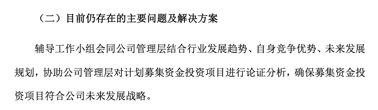 辅导报告中指出,辅导工作小组会同公司管理层结合行业发展趋势、自身竞争优势、未来发展规划,协助公司管理层对计划募集资金投资项目进行论证分析,确保募集资金投资项目符合公司未来发展战略。