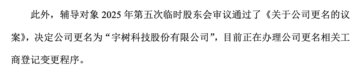另外,辅导对象 2025 年第五次临时股东会审议通过了《关于公司更名的议案》,决定公司更名为“宇树科技股份有限公司”,目前正在办理公司更名相关工商登记变更程序。