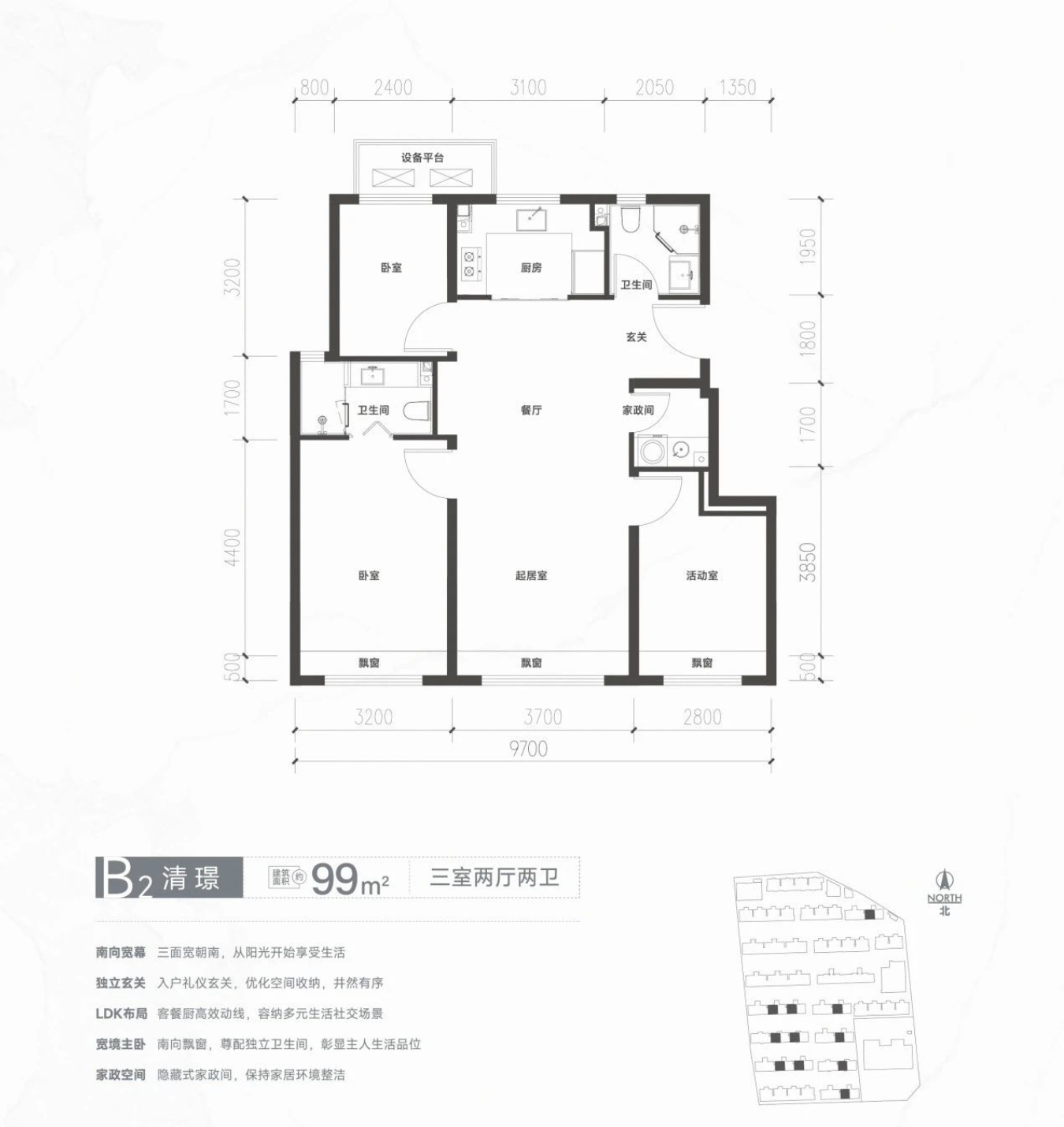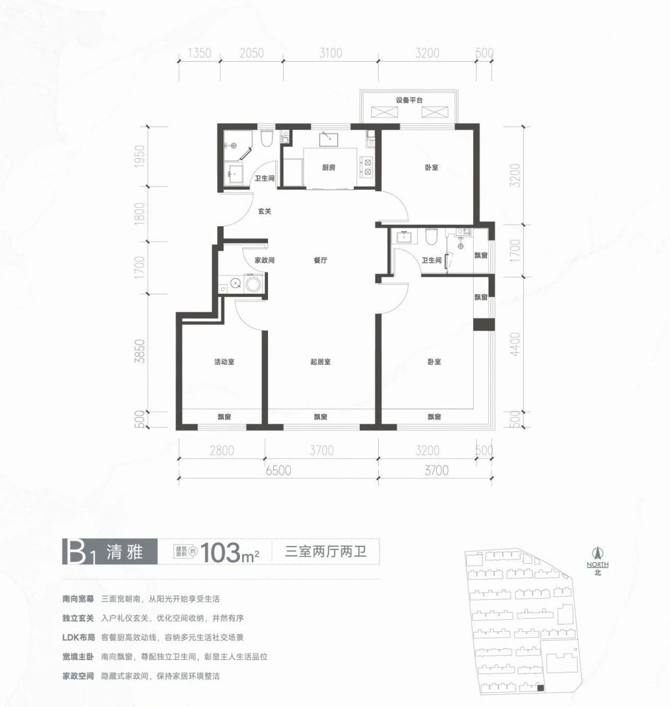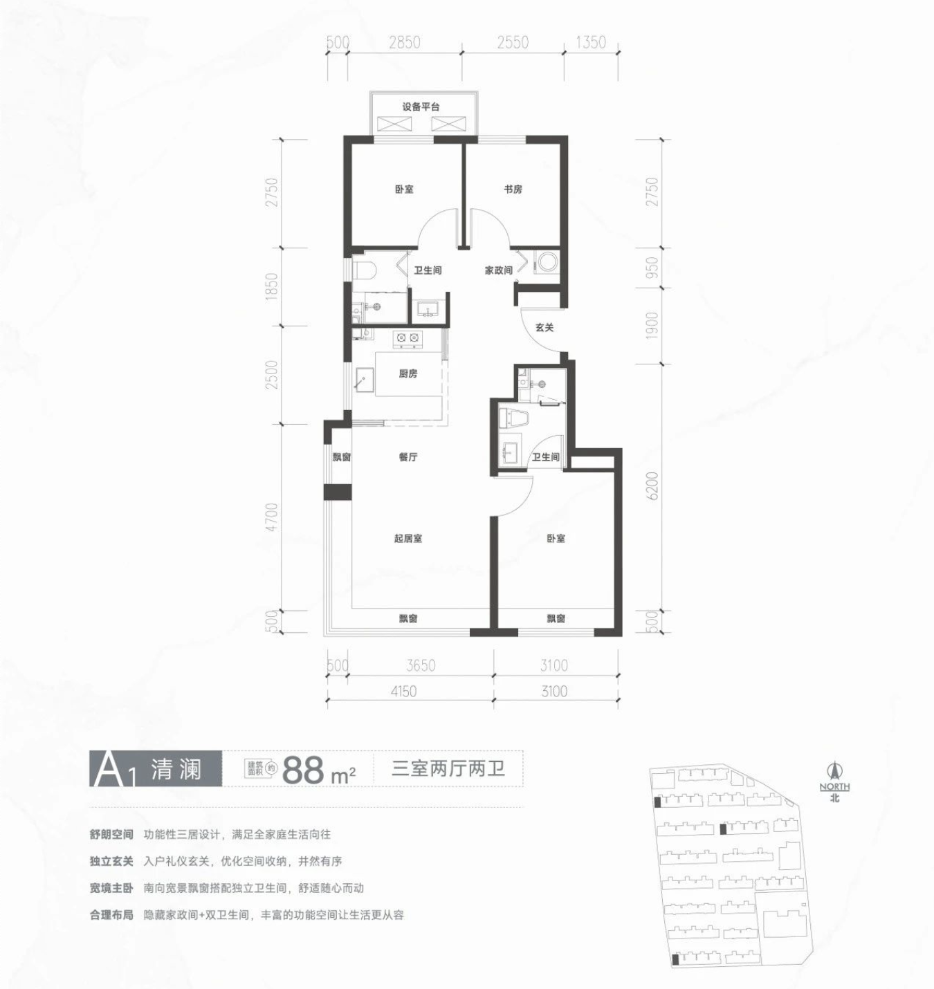 从户型图来看,清樾府在赠送面积也算可圈可点,以86㎡起步户型为例,三房两厅双卫,南向飘窗3.5㎡全赠送,北向设备平台也有将近3㎡。