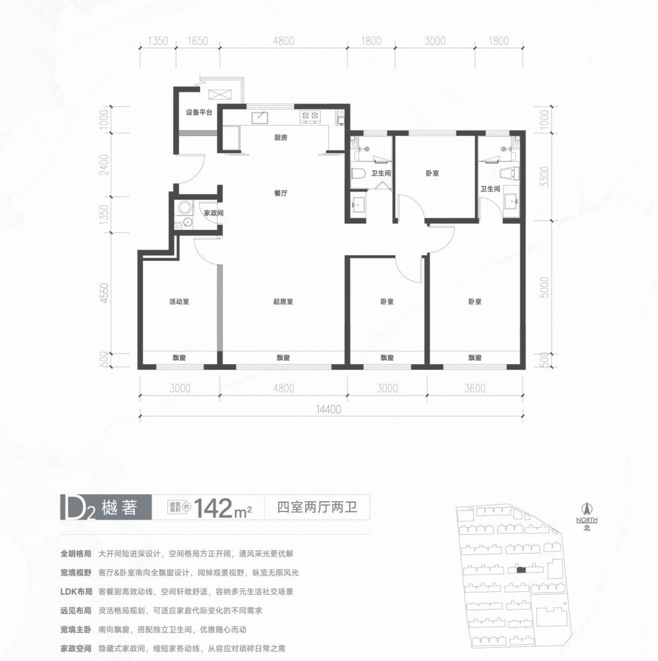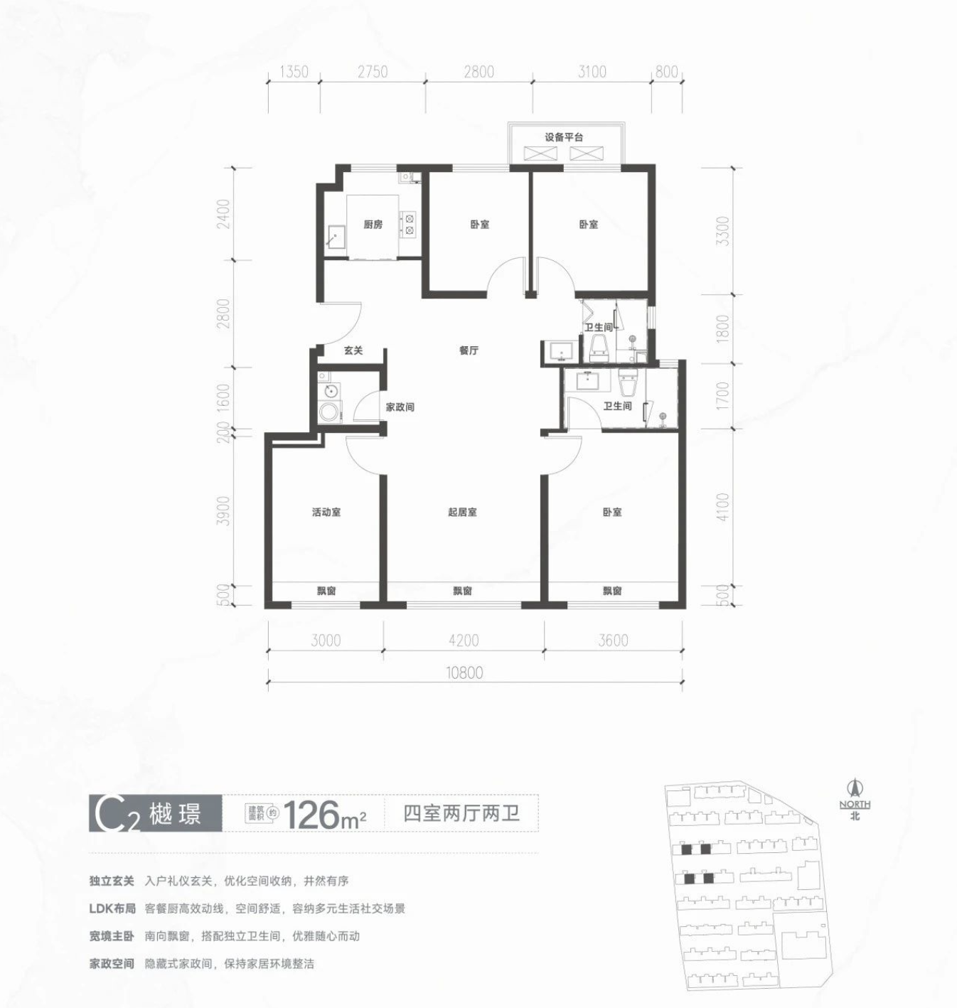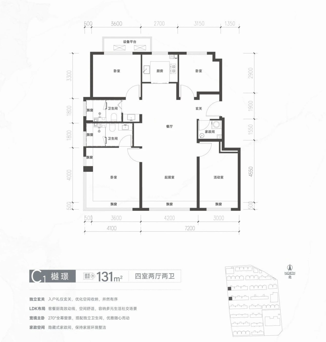 此外,一期产品赠送空间主要是南向+转角/侧边飘窗,北向不可封闭设备平台。