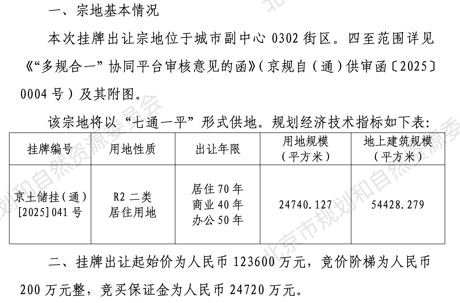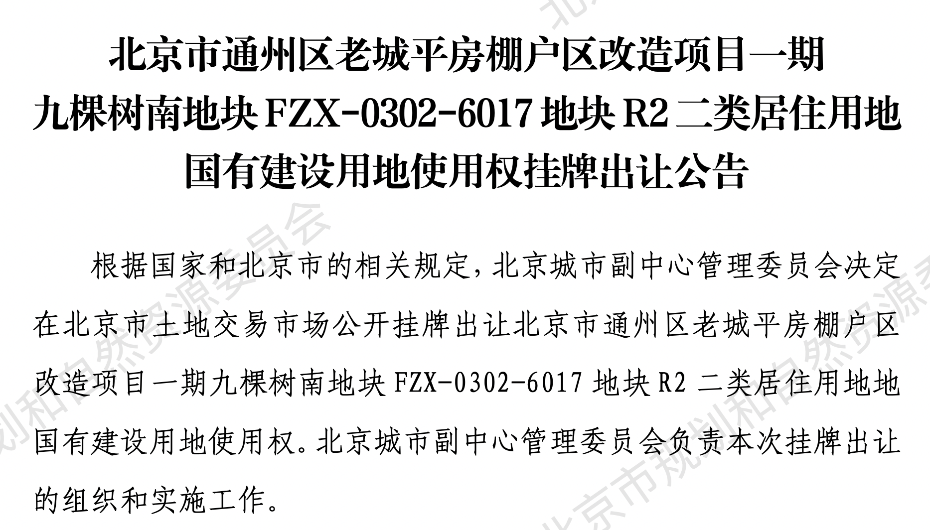 据北京市规划和自然资源委员会发布,决定在北京市土地交易市场公开挂牌出让北京市通州区老城平房棚户区改造项目一期九棵树南地块FZX-0302-6017地块R2二类居住用地地国有建设用地使用权,挂牌出让起始价为12.36亿元。
