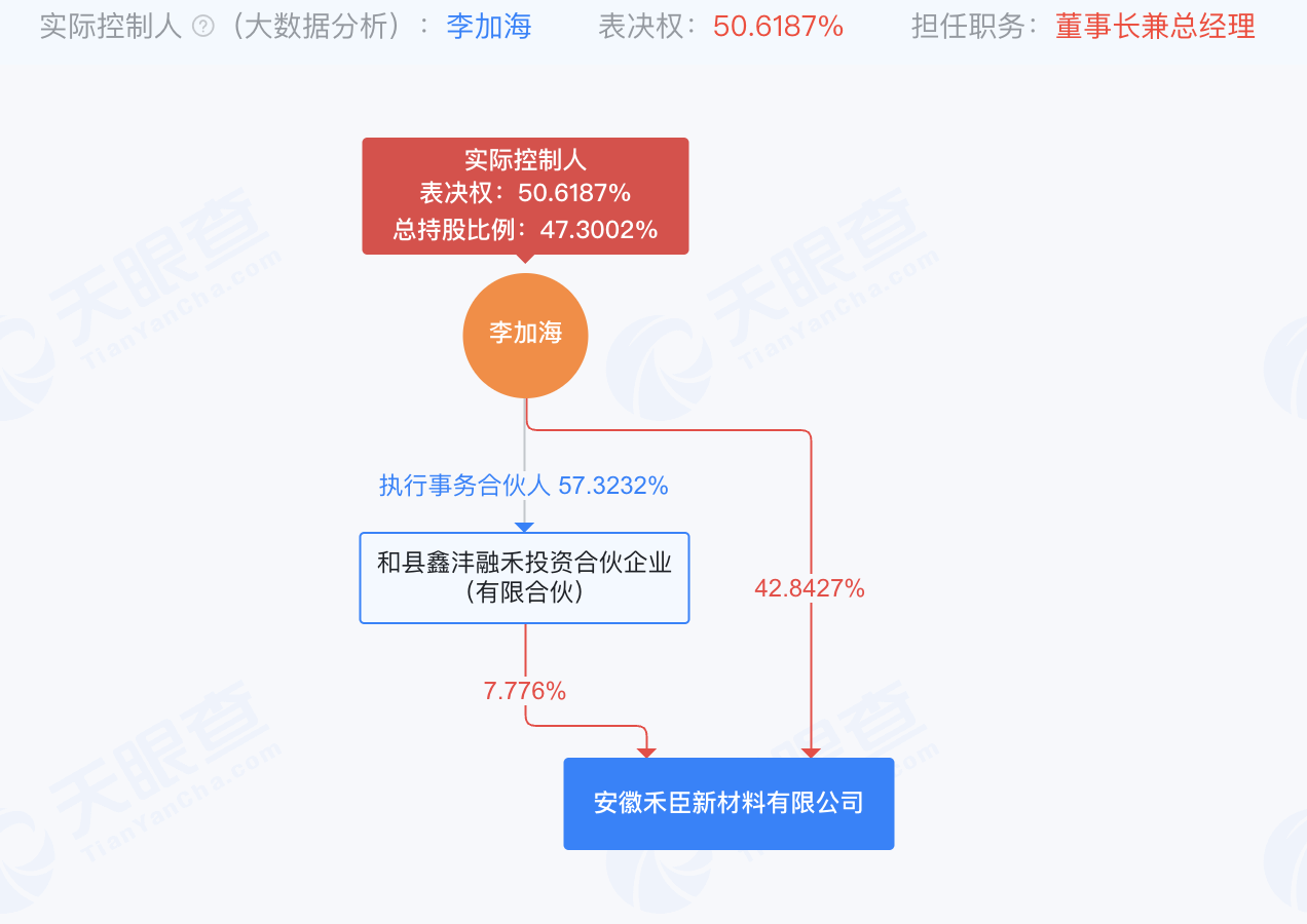 天眼查显示,禾臣新材实际控制人为李加海,总持股比例为47.3%,表决权为50.62%。目前,李加海担任公司董事长兼总经理。
