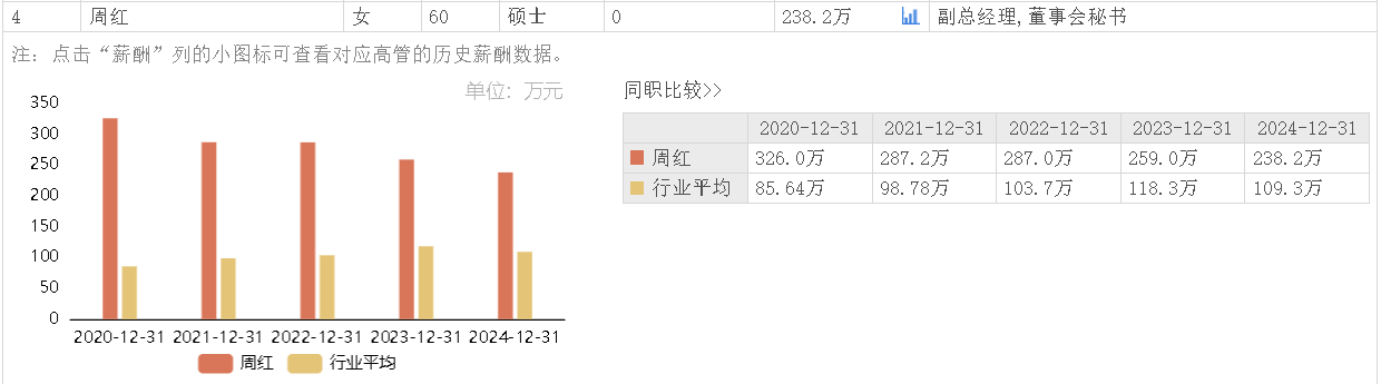 据东方财富网数据,鹏鼎控股副总经理、董事会秘书周红2024年所获薪酬为238.2万元,相较上年薪酬259万元微降。