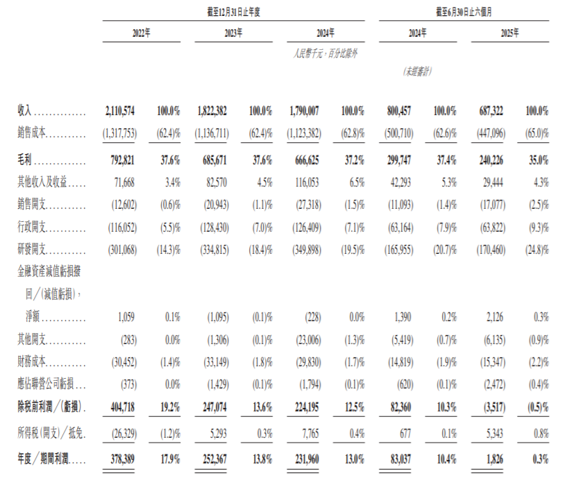业绩方面,于2022年度、2023年度、2024年度及2025年截至6月30日止六个月(报告期内),富瀚微实现收入分别约为21.11亿元、18.22亿元、17.9亿元及6.87亿元;同期,年度/期内利润分别约为3.78亿元、2.52亿元、2.32亿元及182.6万元。