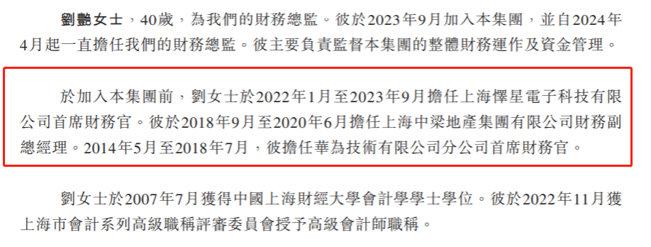 于加入集团前,刘艳于2022年1月至2023年9月担任上海怿星电子科技有限公司首席财务官;于2018年9月至2020年6月担任上海中梁地产集团有限公司财务副总经理;2014年5月至2018年7月,担任华为技术有限公司分公司首席财务官。