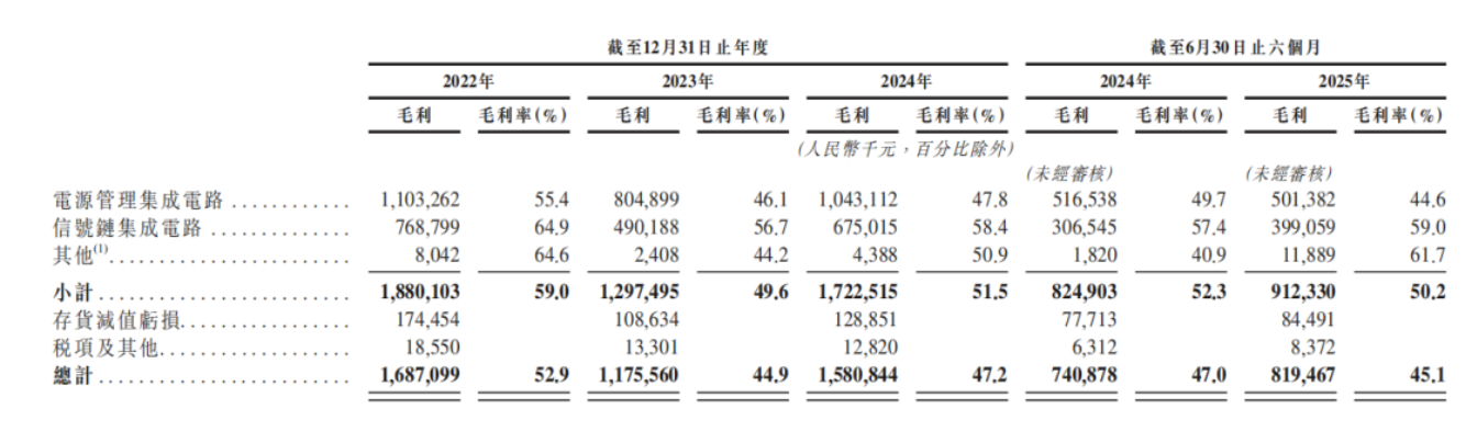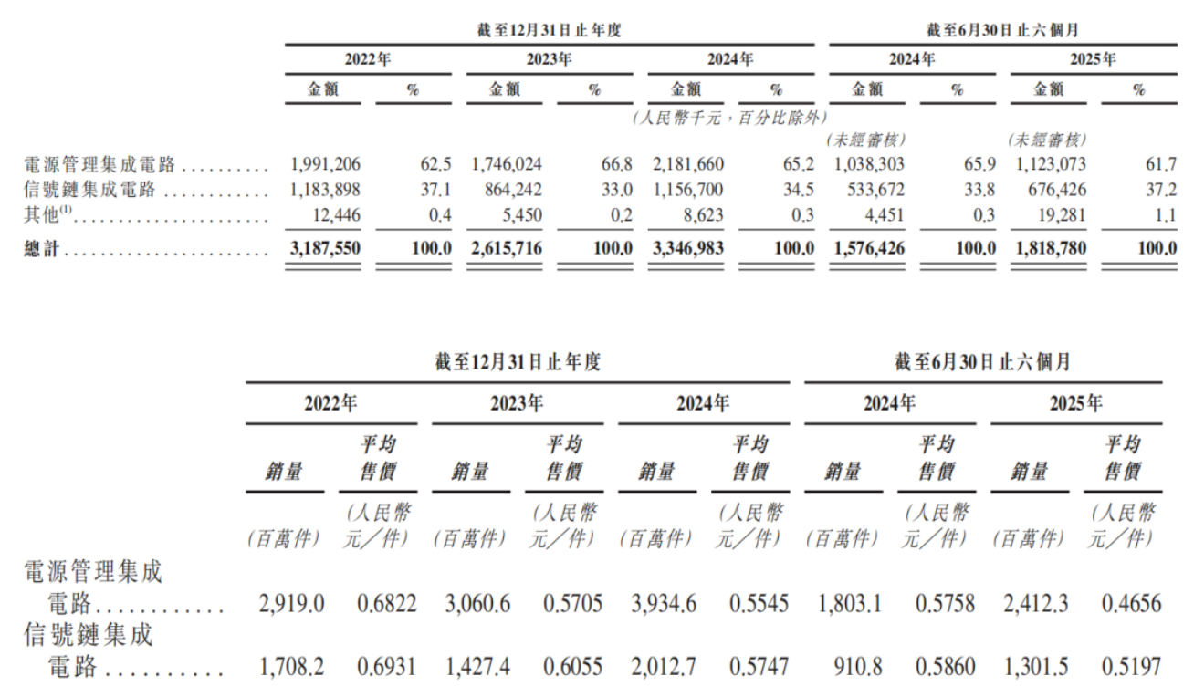 圣邦股份的收入主要来自销售电源管理集成电路产品和信号链集成电路产品,其中有60%以上收入来自销售电源管理集成电路产品,期内累计出货量123.27万颗。但报告期内,该产品的平均售价从2022年的0.6822元/件,下降至2024年的0.5545元/件,降幅18.72%;2025年上半年为0.4656元/件,同比下降19.14%。