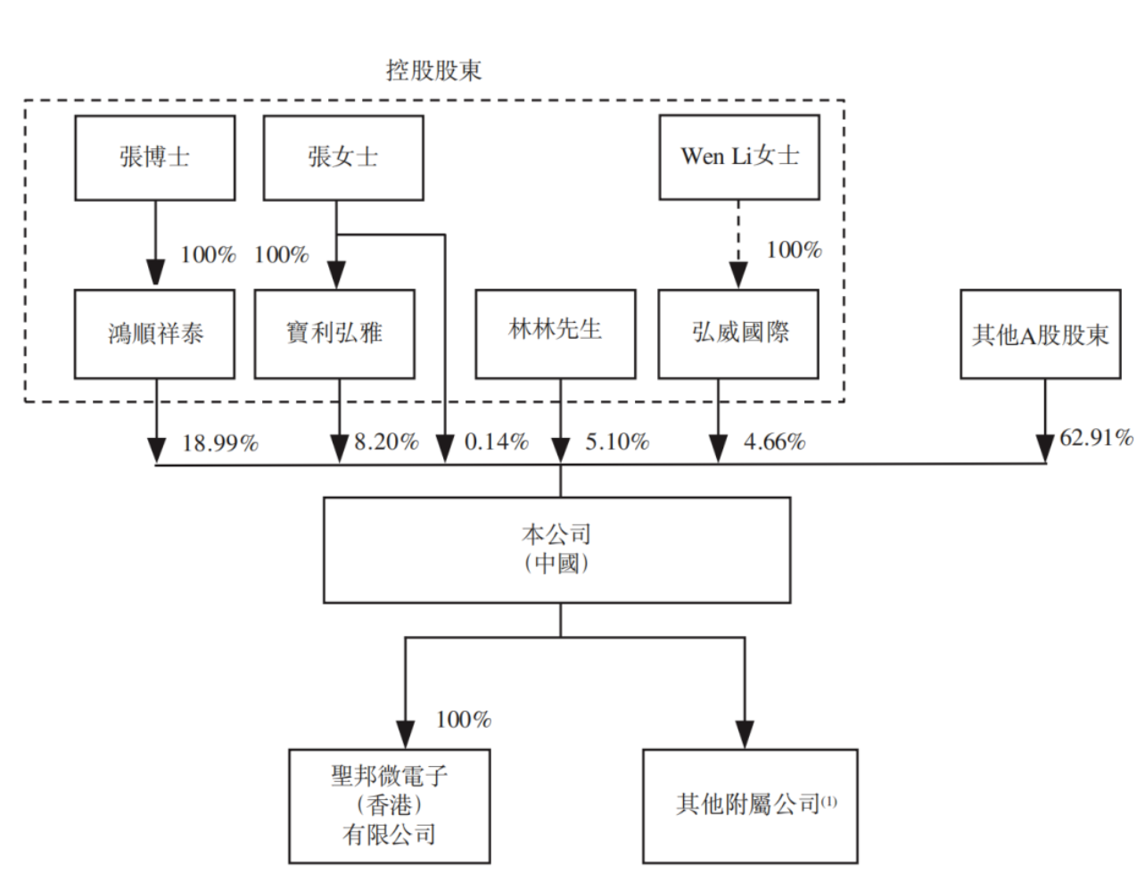 截至递表,圣邦股份由鸿顺祥泰、宝利弘雅、弘威国际、张世龙、张勤、林林及Wen Li作为一组控股股东,合计持股约37.09%,其他A股股东合计持股约62.91%。