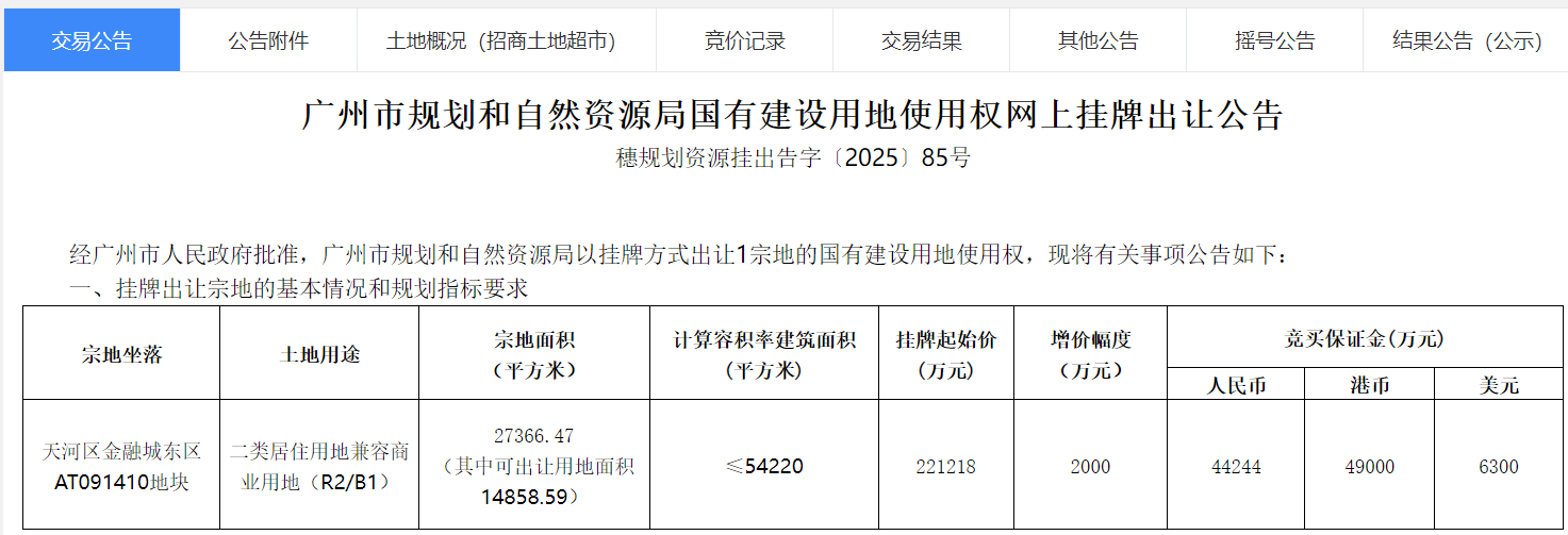 粤进深 赵盼盼 11月14日,广州市规划和自然资源局发布天河区金融城东区AT091410地块出让公告。