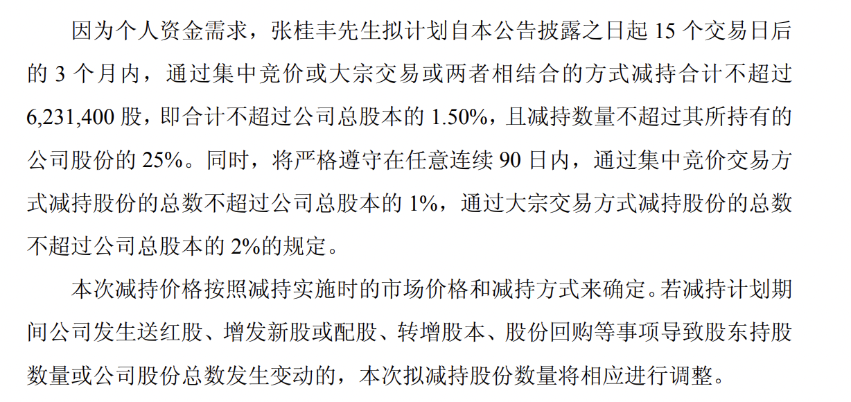 因为个人资金需求,张桂丰拟计划自本公告披露之日起15个交易日后的3个月内,通过集中竞价或大宗交易或两者相结合的方式减持合计不超过623.14万股,即合计不超过公司总股本的1.50%,且减持数量不超过其所持有的公司股份的25%。