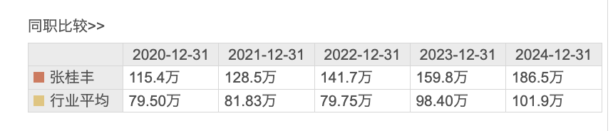 东方财富数据显示,2020年至2024年,张桂丰薪酬分别为115.4万元、128.5万元、141.7万元、159.8万元、186.5万元。