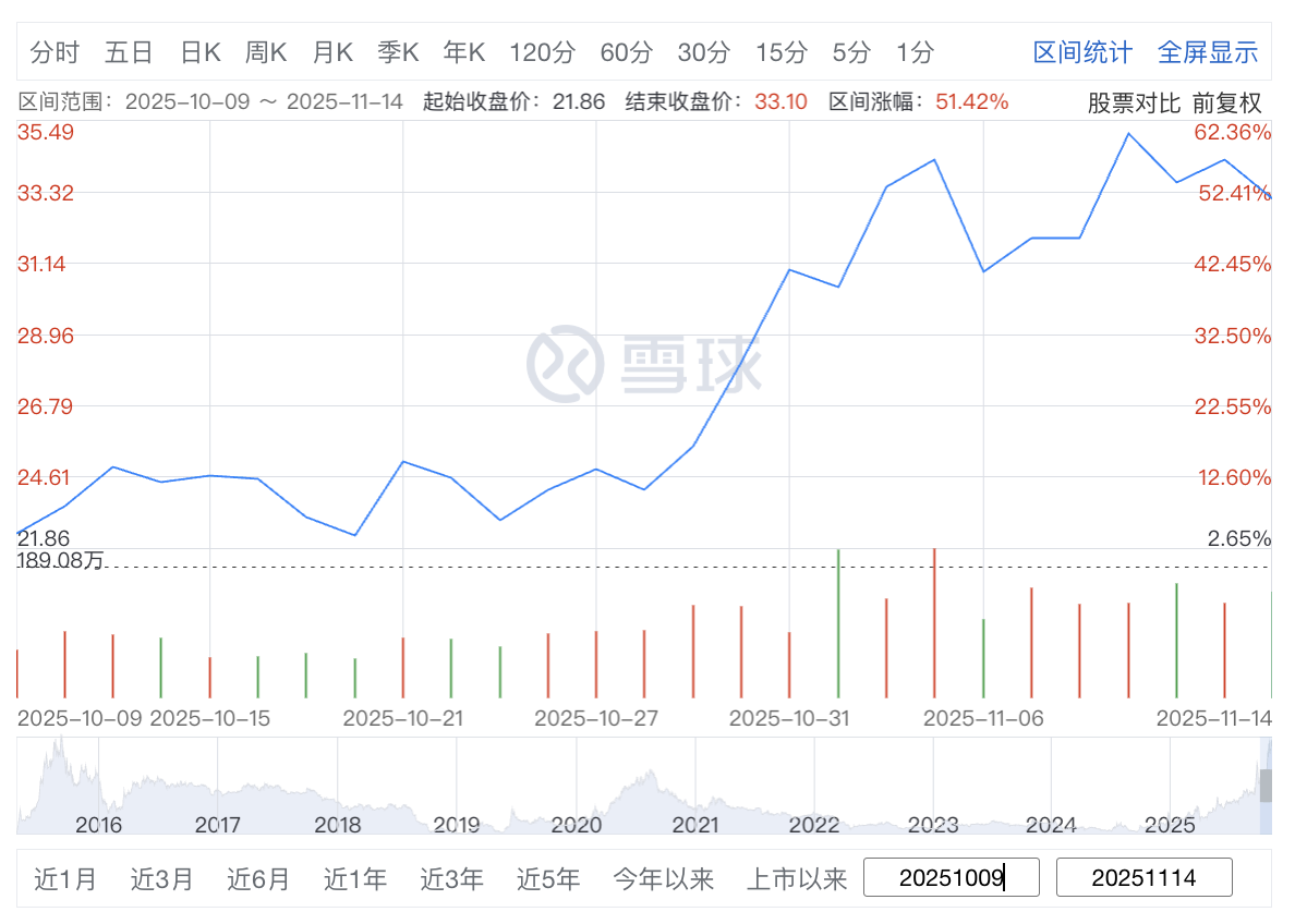 截至2025年11月14日,福龙马收盘价33.1元,当日跌3.5%,总市值137.51亿元。2025年10月9日至11月14日,福龙马区间涨幅为51.42%。
