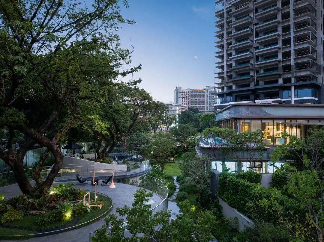 项目通过原址保留3棵原生古榕树,打造了约2000㎡的月牙形榕树公园前厅;里面则打造7000㎡的艺术园林,从而形成了9000㎡内外双花园。