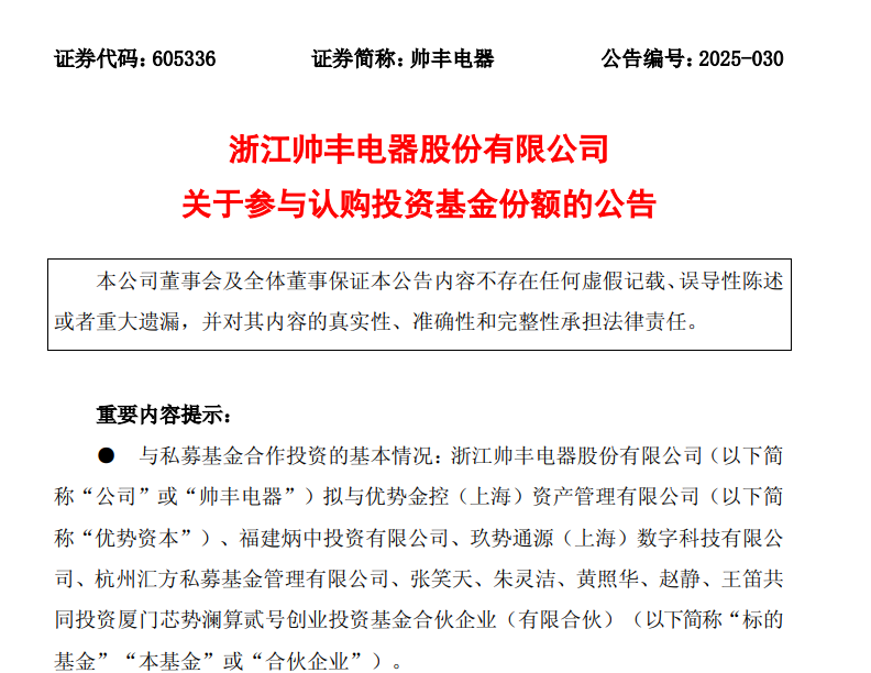 据公告,帅丰电器拟与优势金控(上海)资产管理有限公司、福建炳中投资有限公司、玖势通源(上海)数字科技有限公司、杭州汇方私募基金管理有限公司、张笑天、朱灵洁、黄照华、赵静、王笛共同投资厦门芯势澜算贰号创业投资基金合伙企业(有限合伙)。