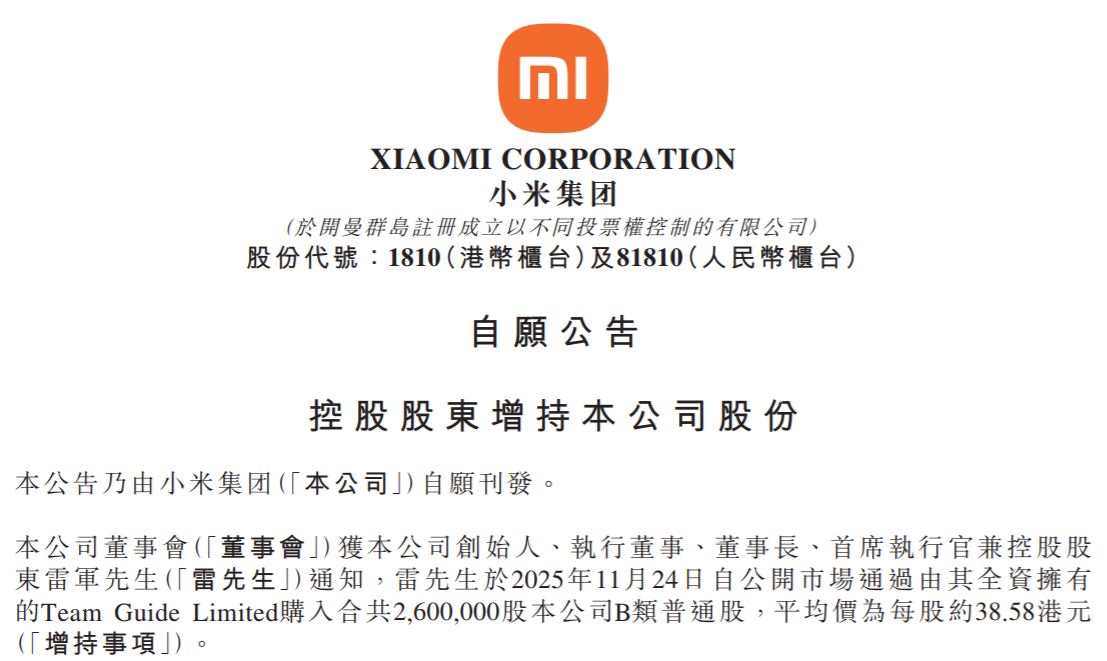 雷军个人斥资超1亿港元增持小米股票,持股比例增至23.26%