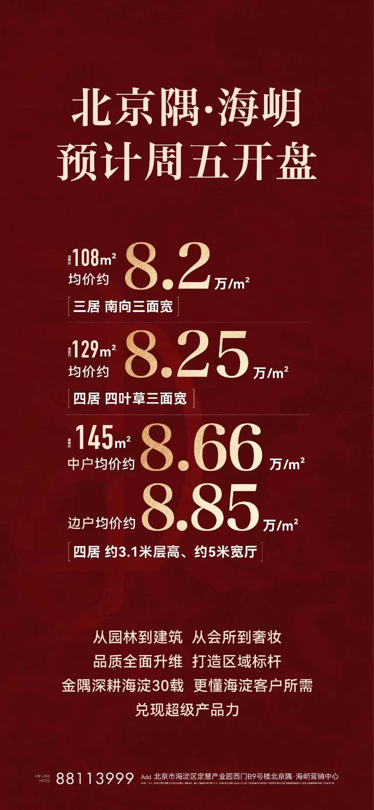 北京隅海岄发布价格体系:单价8.2万元~8.85万元/平米