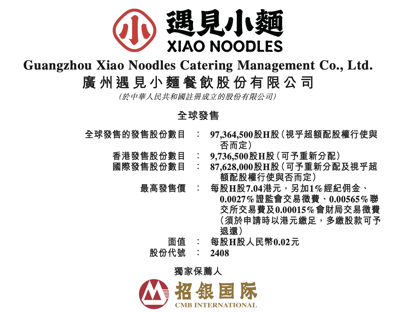 据了解,遇见小面计划在本次IPO中发行9736.45万股H股,其中,香港公开发售973.65万股H股,国际发售8762.8万股H股,发行区间为每股5.64港元至7.04港元。