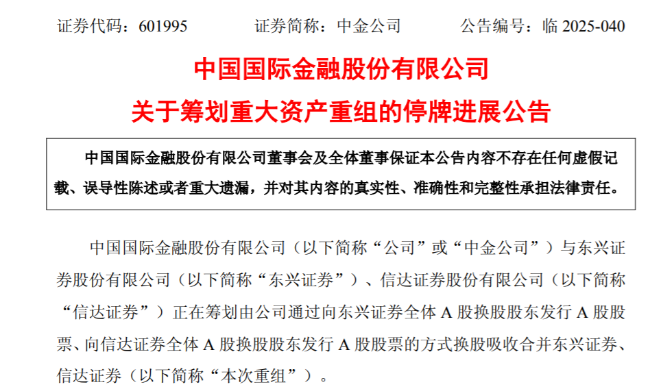 中金公司表示,本次重组涉及到A+H股两地上市公司同时吸收合并两家A股上市公司,涉及事项较多、流程较为复杂,根据上海证券交易所的相关规定,预计停牌时间不超过25个交易日。