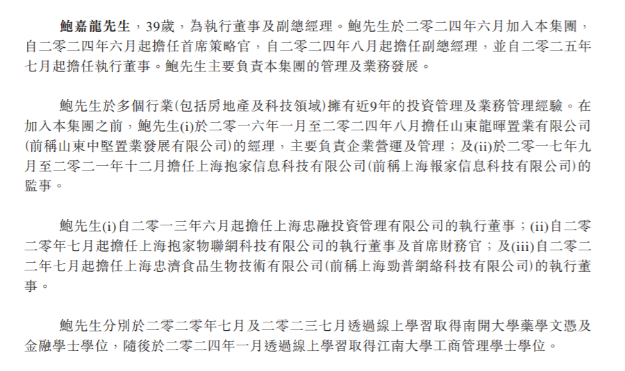鲍嘉龙于多个行业(包括房地产及科技领域)拥有近9年的投资管理及业务管理经验。在加入集团之前,他于2016年1月至2024年8月担任山东龙晖置业有限公司(前称山东中坚置业发展有限公司)的经理,主要负责企业营运及管理;及于2017年9月至2021年十2月担任上海抱家信息科技有限公司(前称上海报家信息科技有限公司)的监事;自2013年6月起担任上海忠融投资管理有限公司的执行董事;自2020年7月起担任上海抱家物联网科技有限公司的执行董事及首席财务官;及自2022年7月起担任上海忠济食品生物技术有限公司(前称上海劲普网络科技有限公司)的执行董事。