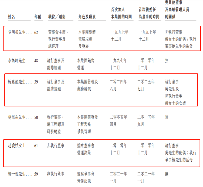 62岁吴明根目前担任公司董事会主席、执行董事兼总经理,61岁赵爱娱任非执行董事。
